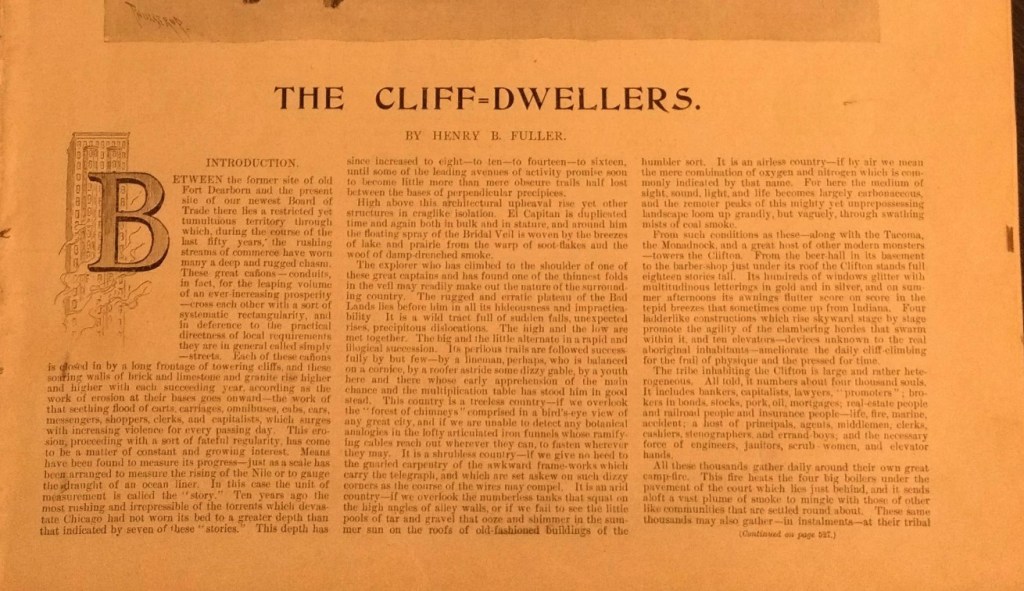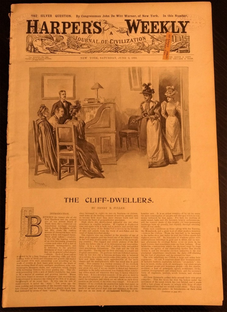 The Cliff-Dwellers (1893) was Henry Blake Fuller‘s third novel and his most widely read. While his first two novels were satirical romances set in Europe with almost no dialogue, The Cliff-Dwellers was radically different — a realistic drama set in Chicago on the eve of the world’s fair. The story was originally serialized chapter by chapter in Harper’s Weekly from June to August 1893, as part of their coverage of the World’s Columbian Exposition in Chicago, then published as a hardcover volume later that year by Harper & Brothers in New York.